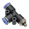 Pneumatic fittings, push in fittings male run tee is used to connect a female threaded connection to a straight tube and to a second tube at a 90-degree angle. Male run tee pneumatic fitting with threaded connections can be rotated after installation to allow for variations in piping direction. Pneumatic push to connect fitting male run tee is made of strong thermoplastic (PBT) and has stainless steel tube gripping claw; threaded component is made of nickel plated brass. Pre-coated Teflon threads are ready to use without additional sealing. External tightening with a flat wrench. Accommodate metric tubing O.D ranging from 4 mm to 16 mm, inch tubing O.D ranging from 1/8" to 1/2". Thread sizes range fromM5, M6, R, PT, BSPT 1/8 to R, PT, BSP T1/2.