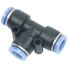PE 09 equal tee fitting push in fitting is used to connect two 9mm tubing in straight line and one branch at a right angle from the middle of the tee with same diameter. 9mm O.D tubing x 9mm O.D tubing union tee push to connect fitting is made of strong thermoplastic (PBT) and stainless steel tube gripping claw. 9mm O.D tubing equal union tee push in fittings enable quick tubing connection and disconnection.