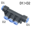 Pneumatic fitting, push in fitting union branch reducer is used for in-line distribution of air to three smaller diameter tubing connections at a 90° angle to the supply line. Pneumatic push to connect fitting union triple branch reducer is made of strong thermoplastic (PBT) and has stainless steel tube gripping claw. Push in fitting union triple branch reducer is push-to-connect quick connect and quick release. Simple installation--push the tubing in, and the connection is complete. To release the tubing, press the release sleeve on the fitting, and you can easily pull the tube out. Accommodate metric tubing O.D ranging from 4 mm to 12 mm, inch tubing O.D ranging from 1/8" to 1/2".