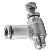 SJSC 3/8-N04 flow controller stainless steel push to connect fitting is used to connect a 3/8" tubing connection a female 1/2 NPT thread at a right angle, provides accurate flow regulation for precise speed control of pneumatic cylinders as well as gas flow in environments with high temperature, mechanical or chemical constraints. 3/8" O.D tubing x 1/2 NPT flow control valve stainless steel push in fitting is made of 316 stainless steel for corrosion resistance, FKM sealing material for chemical-resistance. 3/8" O.D tubing x 1/2 NPT flow control regulator stainless steel fittings have been designed and manufactured to be fully resistant to all types of corrosive materials and environmental factors. Control-out and control-in flow control valves are available.