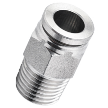 SPC 1/4-N02 male straight stainless steel push to connect fitting is used to connect a female 1/4 NPT thread to a 1/4" O.D tubing in the same direction. 1/4" O.D tubing x 1/4 NPT male connector stainless steel push in fitting is made of 316 stainless steel for corrosion resistance, FKM o-ring for chemical-resistance. 1/4" O.D tubing x 1/4 NPT male straight connector stainless steel pneumatic fitting is suitable for air, pneumatic, machine tools, food and beverage applications. 1/4" O.D tubing x 1/4 NPT male stud straight stainless steel fittings are normally used in food production areas where stainless steel components are required to prevent food contamination. External tightening with a flat wrench.