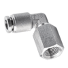 Stainless steel push to connect fitting female elbow swivel is used to connect a tubing to a male threaded connection at a right angle. Stainless steel push to connect fitting female elbow is made of stainless steel for corrosion resistance, FKM / Viton sealing material for chemical-resistance. Female elbow stainless steel push to connect fittings have swivel (rotate 360°) hexagonal thread allowing tightening with flat spanner. These stainless steel psuh to connect fittings are designed to withstand corrosive environments (substances), to channel aggressive fluids and to be used in the food, pharmaceutical and chemical industries. Accommodate metric tubing O.D ranging from 4 mm to 16 mm, inch tubing O.D 1/8" to 1/2". Thread sizes range is from NPT 1/8 to NPT 1/2.