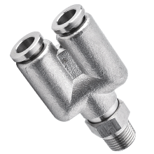 SPX 10-02 male Y connector stainless steel push in fitting provides two 10mm O.D tubing connection parallel to each other, with an opposing PT, R, BSPT 1/4 male thread. This swivel Y-shaped male fitting can be rotated freely, enabling proper positioning of the fitting. 10mm tubing x PT, R, BSPT 1/4 male Y stainless steel fitting is designed to allow fluid flow to be combined or split apart. This 10mm O.D tubing x PT, R, BSPT 1/4 swivel male Y stainless steel push to connect fitting is all stainless steel construction with FKM seals offer excellent resistance to aggressive environments and fluids. The swivel feature on the male stud end allows setting the tube connector where you want after tightening the thread.